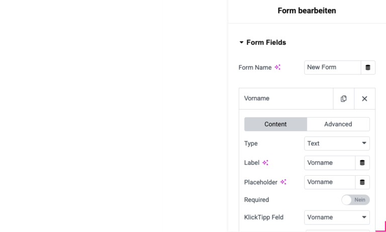 Elementor Pro erforderlichDas Plugin fügt „KlickTipp“ als neue Aktion nach dem Absenden in Elementor Pro hinzu. Bestehende Formulare einfach öffnen, KlickTipp-Aktion wählen, Custom Fields zuordnen und Tags vergeben – fertig.